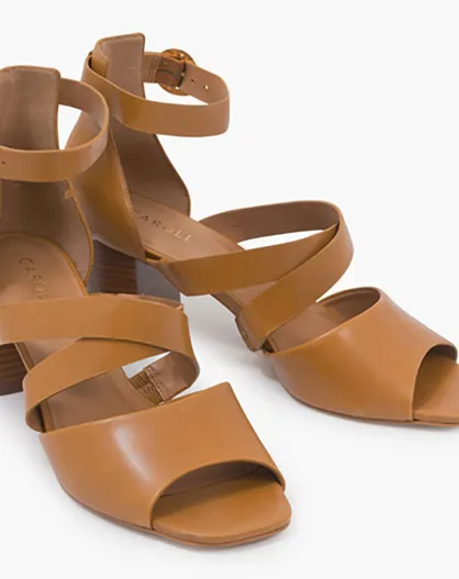 Sandalias de piel filipina camel, tacón de 6,5 cm