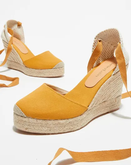Alpargatas textiles y de piel color mostaza, tacón de 10 cm