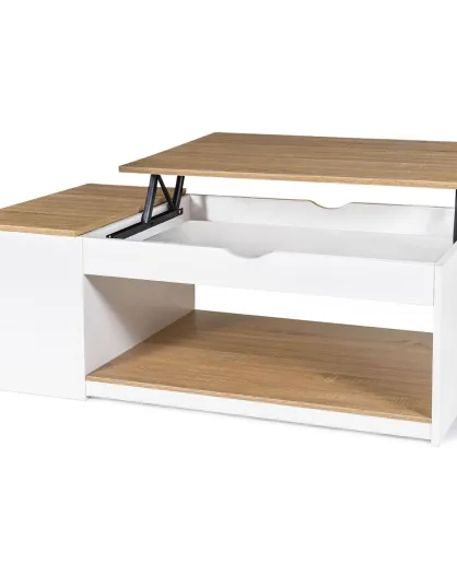 Mesita Stella con tapa elevable y baúl doble de madera y blanco