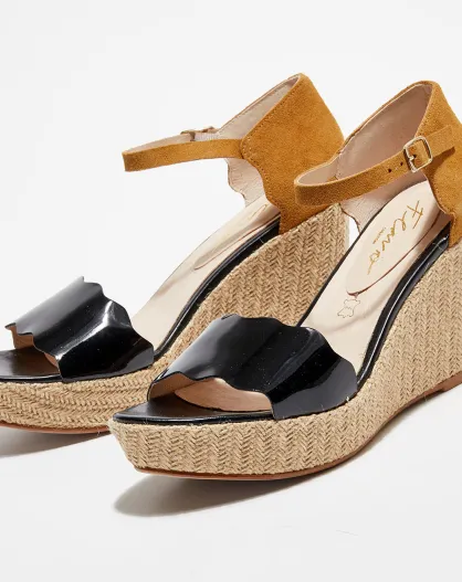 Sandalias Julieta con cuña en charol y terciopelo negro/camel, tacón de 9,5 cm