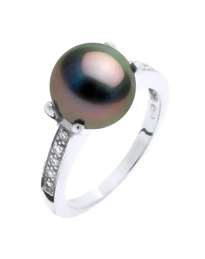 Brazalete de oro blanco, diamantes de 0,10 quilates y perla negra redonda cultivada de Tahití