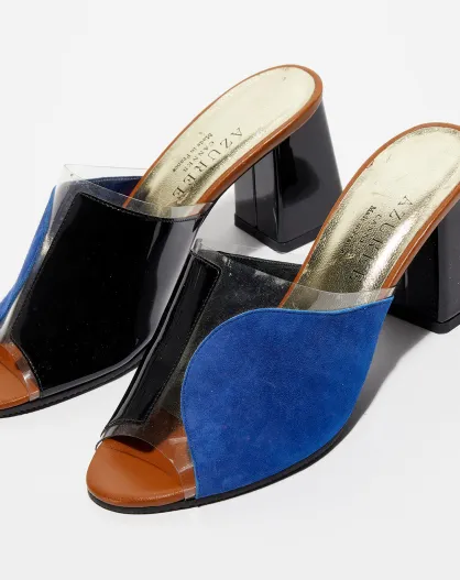 Mules Mandri azul/negro/camel, tacón de 7 cm