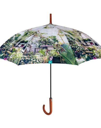 Paraguas recto con sistema de apertura automática y mango de madera - Patrones de hojas de plátano verde