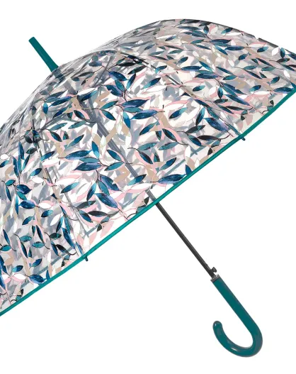 Paraguas con forma de campana transparente, sistema de apertura automática, borde borgoña, hojas multicolores