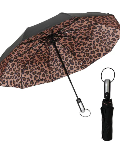 Paraguas plegable de diseño triple con toldo de doble capa - Sistema de apertura automática - Exterior negro con interior con estampado de leopardo multicolor