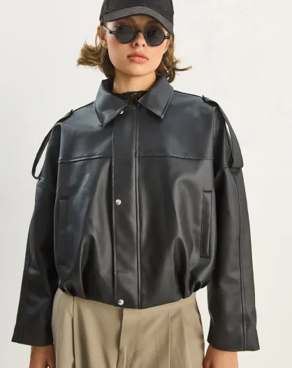 Chaqueta bomber sobredimensionada de piel sintética con cintura elástica negra
