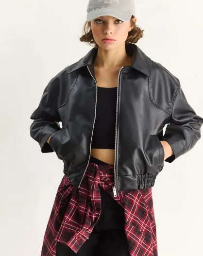 Chaqueta bomber sobredimensionada de piel sintética con cintura elástica negra