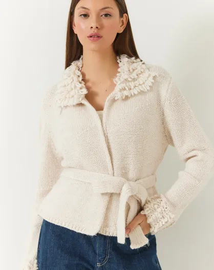 Chaleco tipo cárdigan de punto con flecos y cuello y puños en color crudo