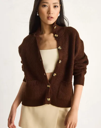 Chaleco de punto con estampado de leopardo y botones en color crudo camel