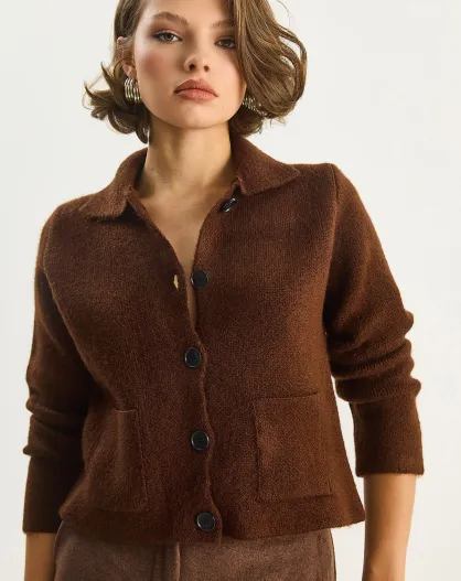 Chaleco de punto con cuello trenzado y ribete de piel de camello