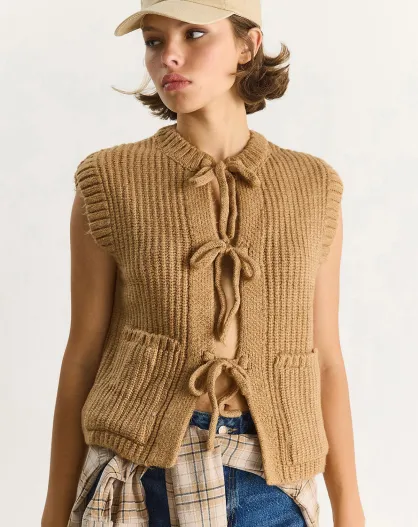 Chaleco sin mangas con lazo en la parte delantera y detalles de bolsillo en camel