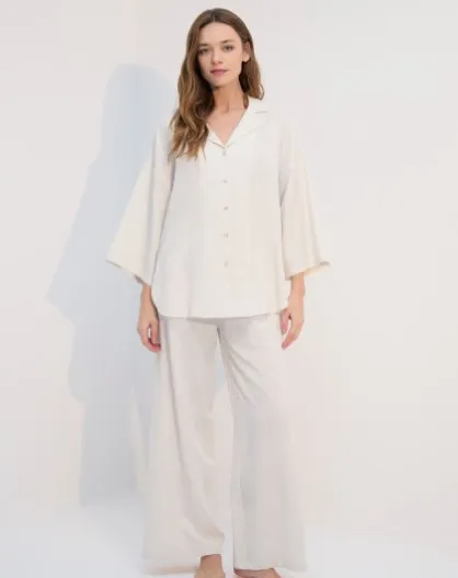Conjunto de pijama con cuello camisero bordado en color crudo BM-1830