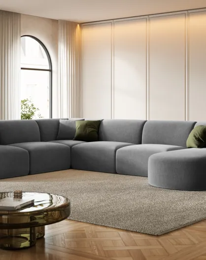 Sofá modular de esquina derecha panorámico de terciopelo gris de 7 plazas Talia, 330 x 255 x 70 cm