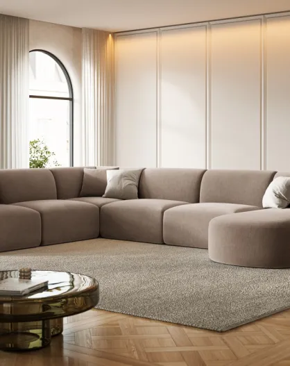 Sofá modular de esquina izquierda panorámico de terciopelo beige oscuro de 7 plazas Talia, 330 x 255 x 70 cm