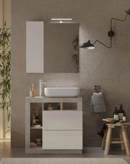 Ancona - Mueble de baño con patas de hormigón coloreado y lacado brillante - 2 cajones + 3 nichos + lavabo sobre encimera - 79x79x49 cm