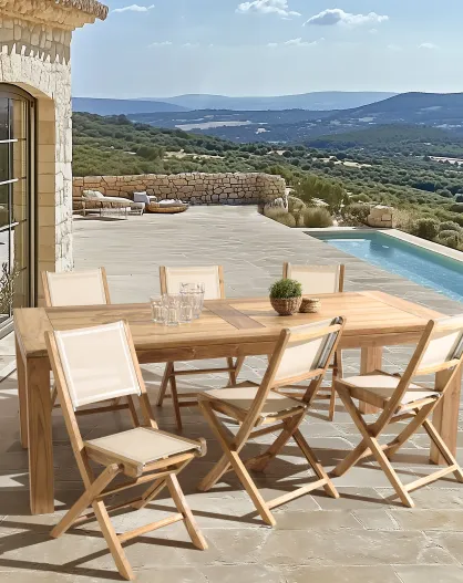 Juego de muebles de jardín Miami de 6 plazas, 1 mesa de jardín de madera de angélica engrasada, 6 sillones de acacia engrasada, color beige