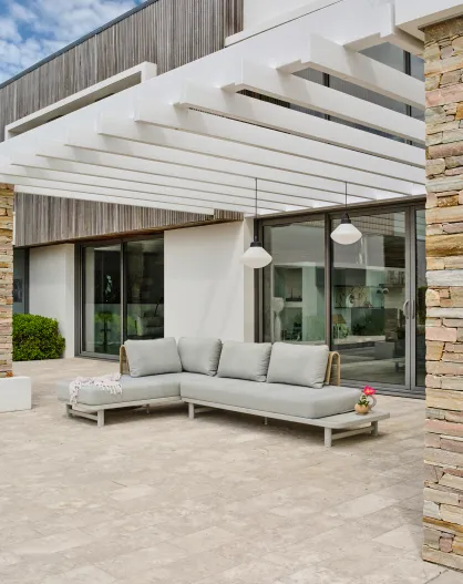 Mueble de jardín esquinero VALENCIA de 6 plazas en teca y aluminio blanco y gris