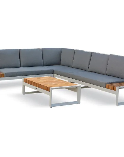 Mueble de jardín esquinero VALENCIA de 6 plazas en teca y aluminio blanco y gris