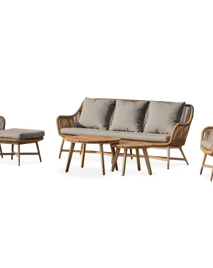 Salón de jardín bajo PALMAS de 5 plazas en aluminio, teca y cuerda tejida marrón y gris