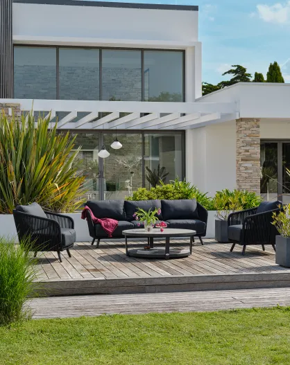Salón de jardín bajo BIARRITZ de 5 plazas en aluminio y cuerda tejida negra y gris antracita