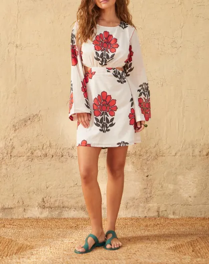 Vestido corto Molly con estampado floral indio Maravoile en combinación de arcilla roja