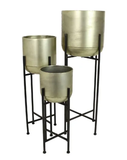 Set de 3 maceteros de metal dorado, base negra, macetero para champán