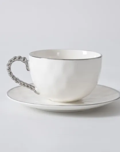 Taza y platillo de té blanco y dorado de Salerno