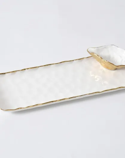 Set de 2 bandejas de sushi con cuenco pequeño para salsas en forma de ostras Portofino blancas y doradas