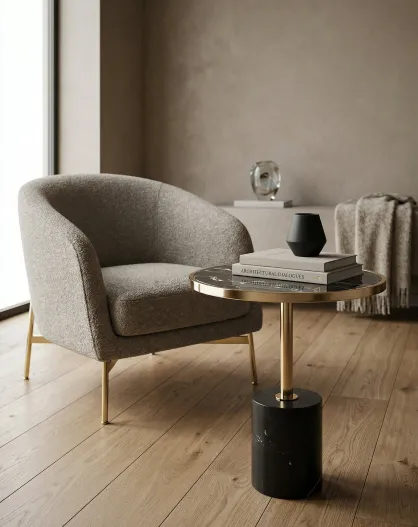 Mesa con pedestal de acero inoxidable, mármol y cristal negro - 46x46x53 cm
