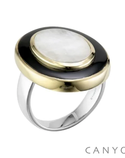 Anillo Bubble de plata y latón, piedra lunar blanca y ónix negro
